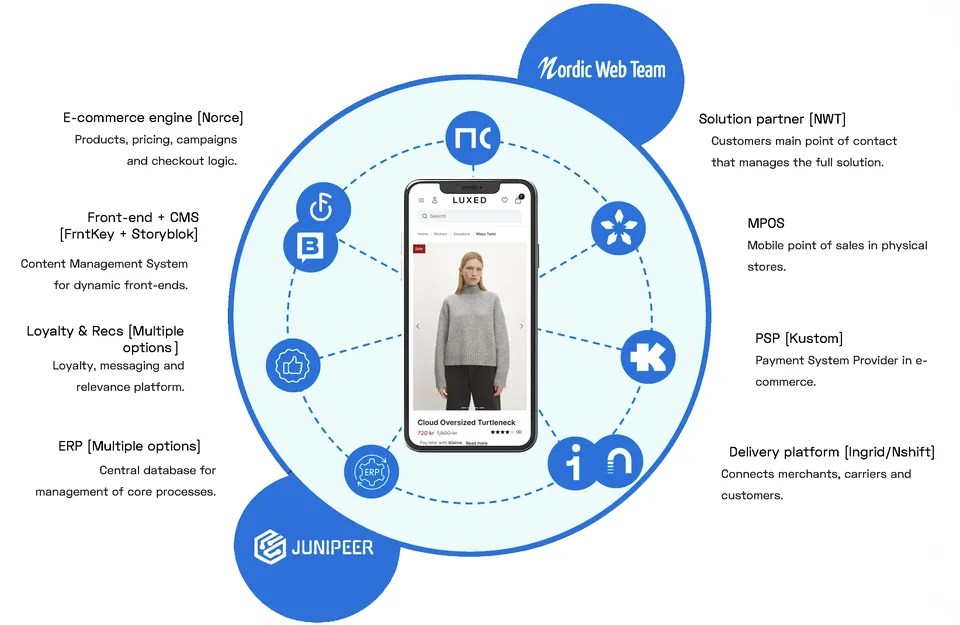 It integrates with platforms like Norce Commerce and Shopware, using Storyblok as the CMS and connecting to a curated set of commerce services.